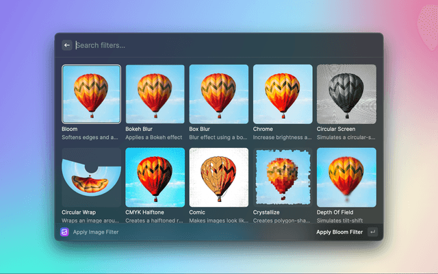 Apply filters and transformations to various image formats, and convert between them. Create new images by specifying their dimensions, colors, and patterns. Operate on selected files or on images in the clipboard.