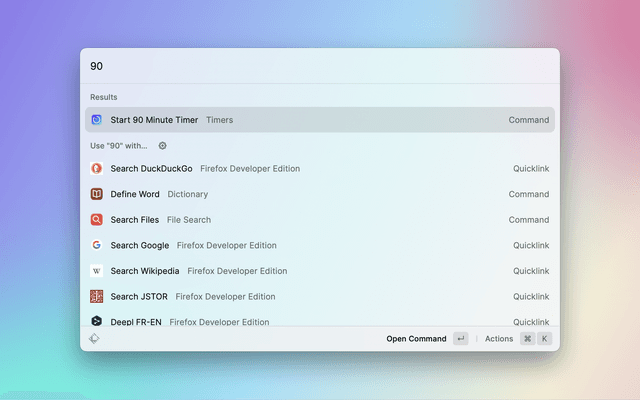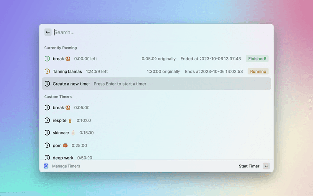 This is a lightweight extension allowing you to start and stop countdown timers, stopwatches, and alarms. It works directly in Raycast, no external apps or dependencies required. Now available in the Raycast Store!