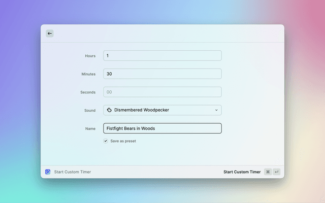 Start, stop, and save countdown timers, directly in Raycast, with no external dependencies.