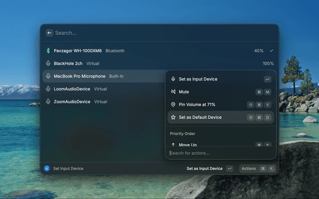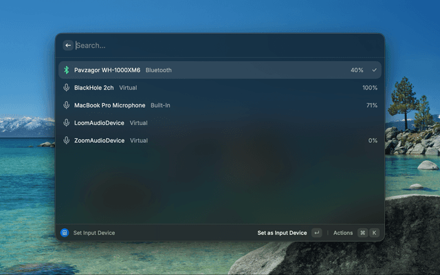 Switch devices. Open "Set Output Device" or "Set Input Device". Press Enter to switch. The window stays open so you can keep working.