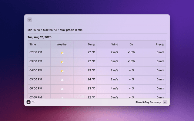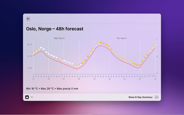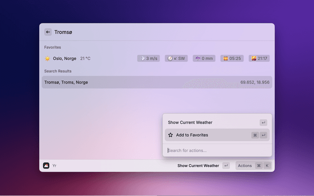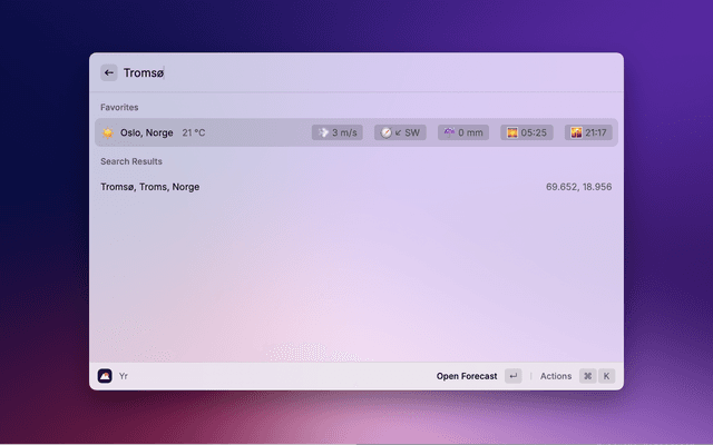 A modern, feature-rich Raycast extension for displaying weather forecasts from The Norwegian Institute of Meteorology (MET). Get accurate weather information with an intuitive interface, smart search, and beautiful visualizations.