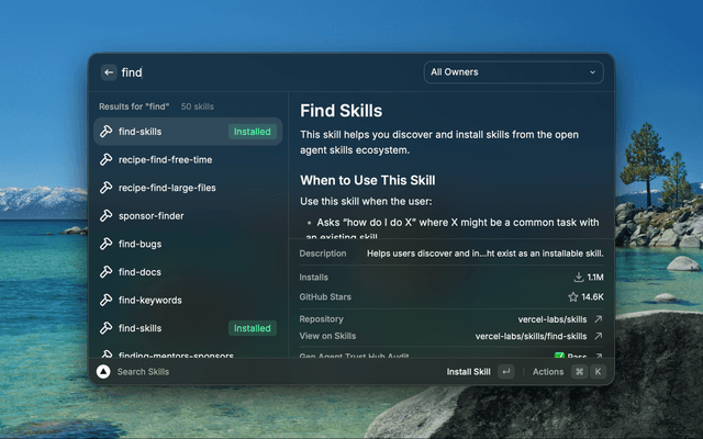 Search for agent skills from skills.sh with real-time results. View skill details in the inline panel, including security audit status when available.