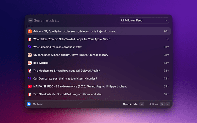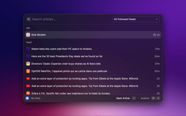 A Raycast extension that goes beyond the original Inoreader experience: it helps you read and triage faster, with a VIP system that immediately surfaces articles from priority sources, plus AI summaries generated from the full article page content.