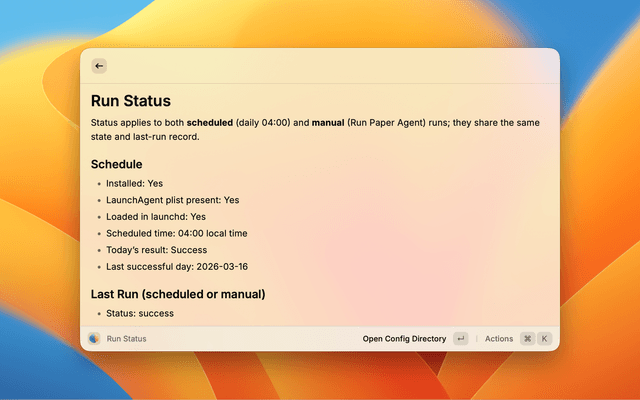 | Install Daily Schedule | Install a macOS launchd job that runs Paper Agent daily at 04:00 and catches up once after boot/login if 04:00 was missed. Re-run after changing Preferences that affect the pipeline. |