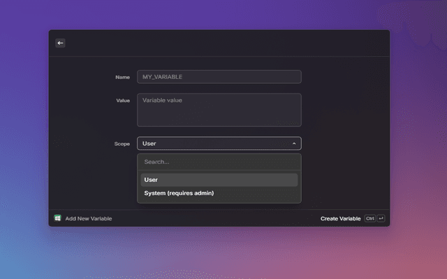 - Add Variables — Create new environment variables with scope selection (User or System)